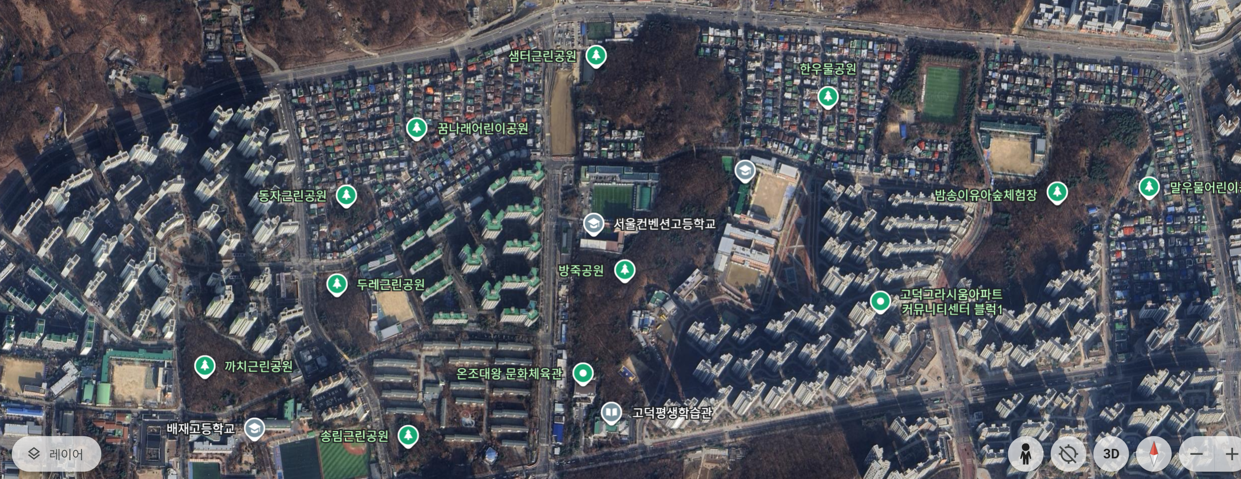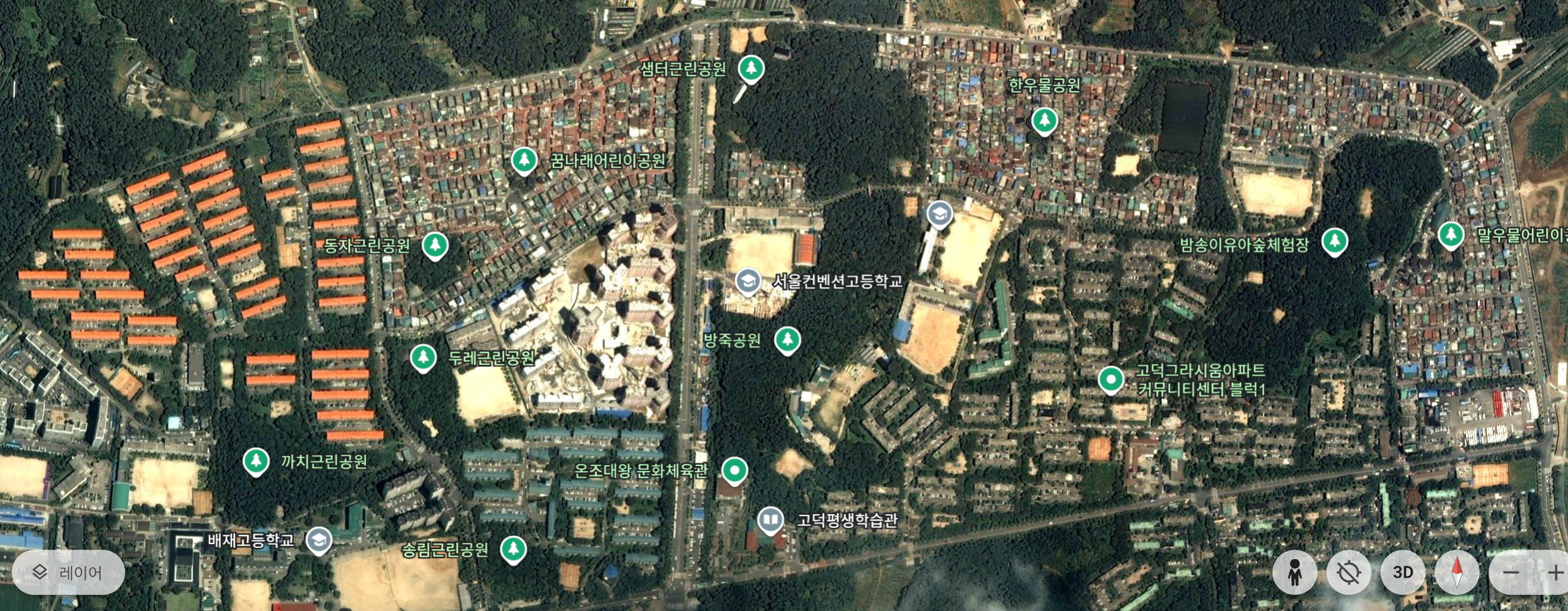 왼쪽부터 래미안 힐스, 고덕 아이파크, 고덕 그라시움, 오른쪽 끝에 잘린 부분이 고덕 리엔파크 1단지, 2단지, 우측 하단 고덕 아르테온이다.